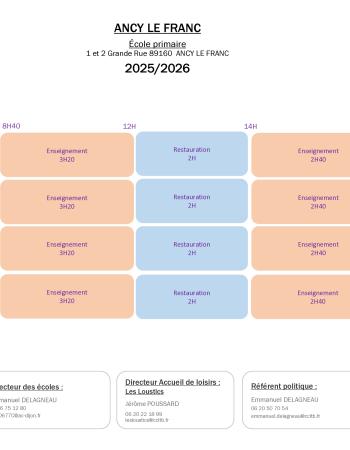 Horaires et informations Horaires école Ancy-le-Franc Consulter Taille : 107.94 Ko Extension du fichier : pdf Publié le 24 Oct. 2025 Menus