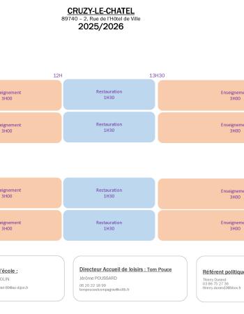 Horaires et informations Horaires école Cruzy-le-Châtel Consulter Taille : 127.32 Ko Extension du fichier : pdf Publié le 24 Oct. 2025 Menus