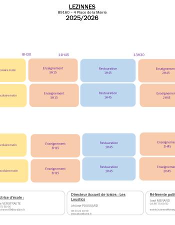 Horaires et informations Horaires école Lézinnes Consulter Taille : 126.98 Ko Extension du fichier : pdf Publié le 24 Oct. 2025 Menus
