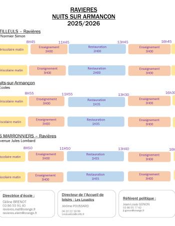 Horaires et informations Horaires école Ravières-Nuits Consulter Taille : 120.44 Ko Extension du fichier : pdf Publié le 24 Oct. 2025 Menus
