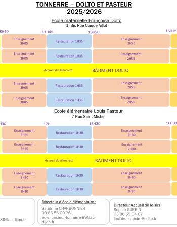 Horaires et informations Horaires école Tonnerre - Dolto et Pasteur Consulter Taille : 242.62 Ko Extension du fichier : pdf Publié le 24 Oct. 2025 Menus