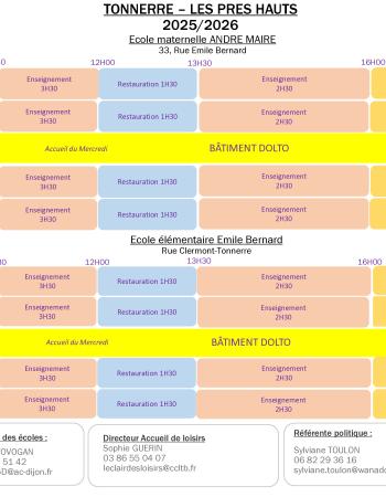 Horaires et informations Horaires école Tonnerre - Les près hauts Consulter Taille : 241.01 Ko Extension du fichier : pdf Publié le 24 Oct. 2025 Menus