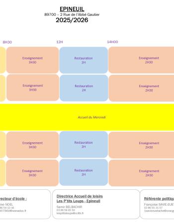 Horaires et informations Horaires école Épineuil Consulter Taille : 123.73 Ko Extension du fichier : pdf Publié le 24 Oct. 2025 Menus